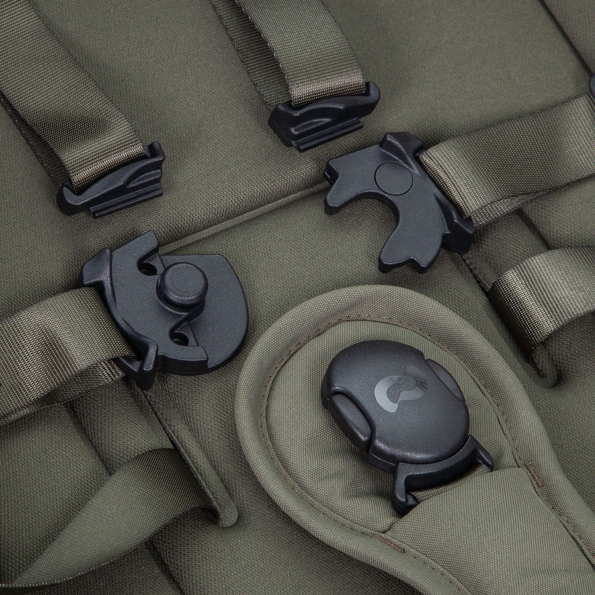 Cinto de segurança ajustável com almofadas macias e fivela magnética.