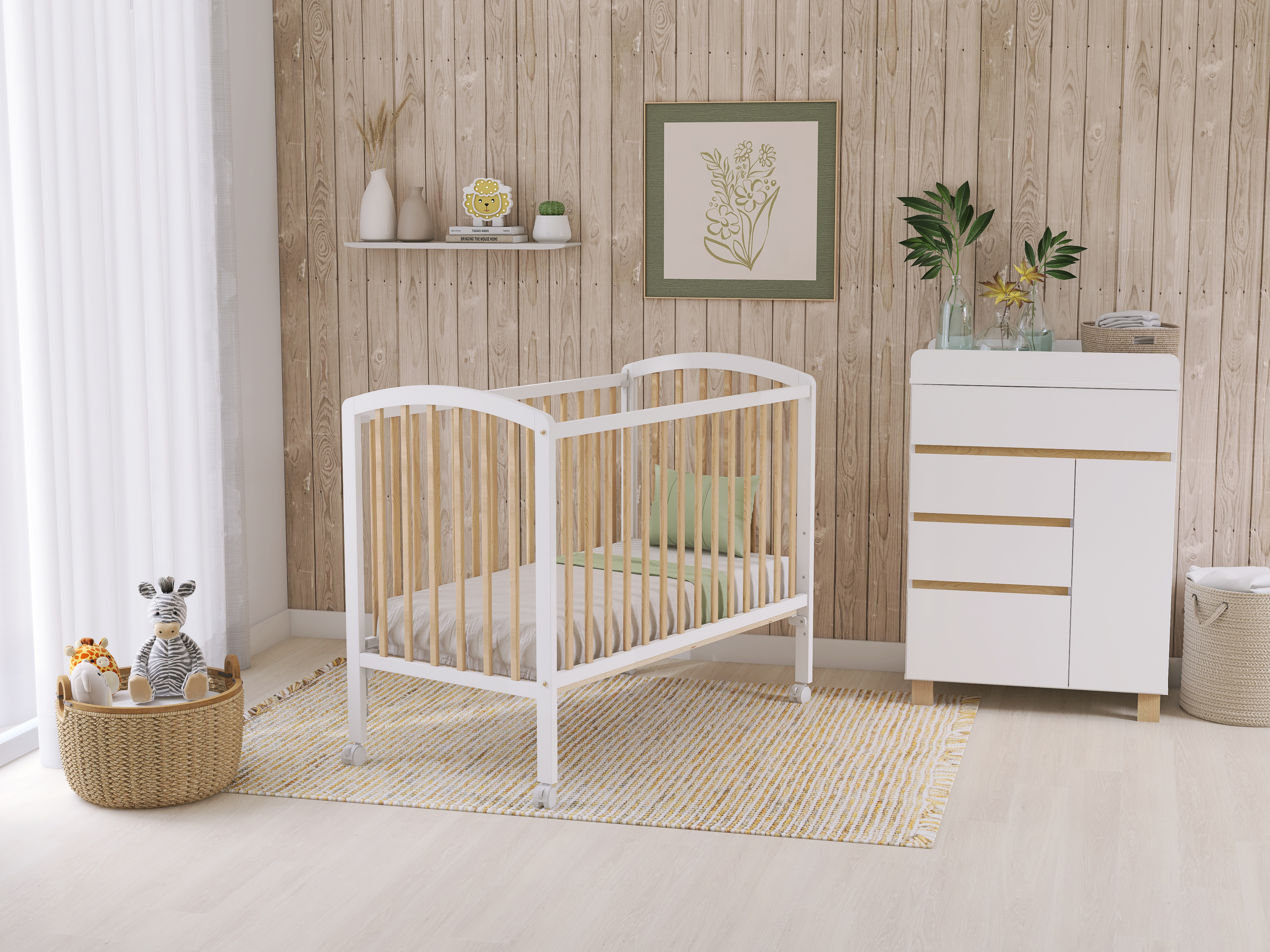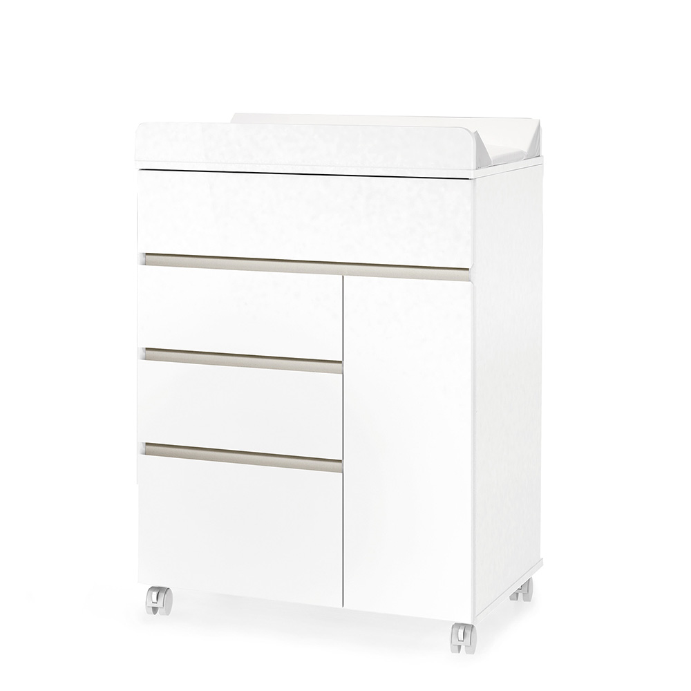 A Cómoda-vestidor Cool inclui um colchão muda-fraldas branco e um conjunto de rodas que permitem transportá-la facilmente.