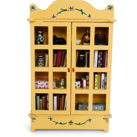 Este kit de móveis inclui uma lareira em miniatura, armário, sofá, poltrona, mesa de centro, mesa lateral e estantes. Tinta, cola e acessórios são vendidos separadamente.