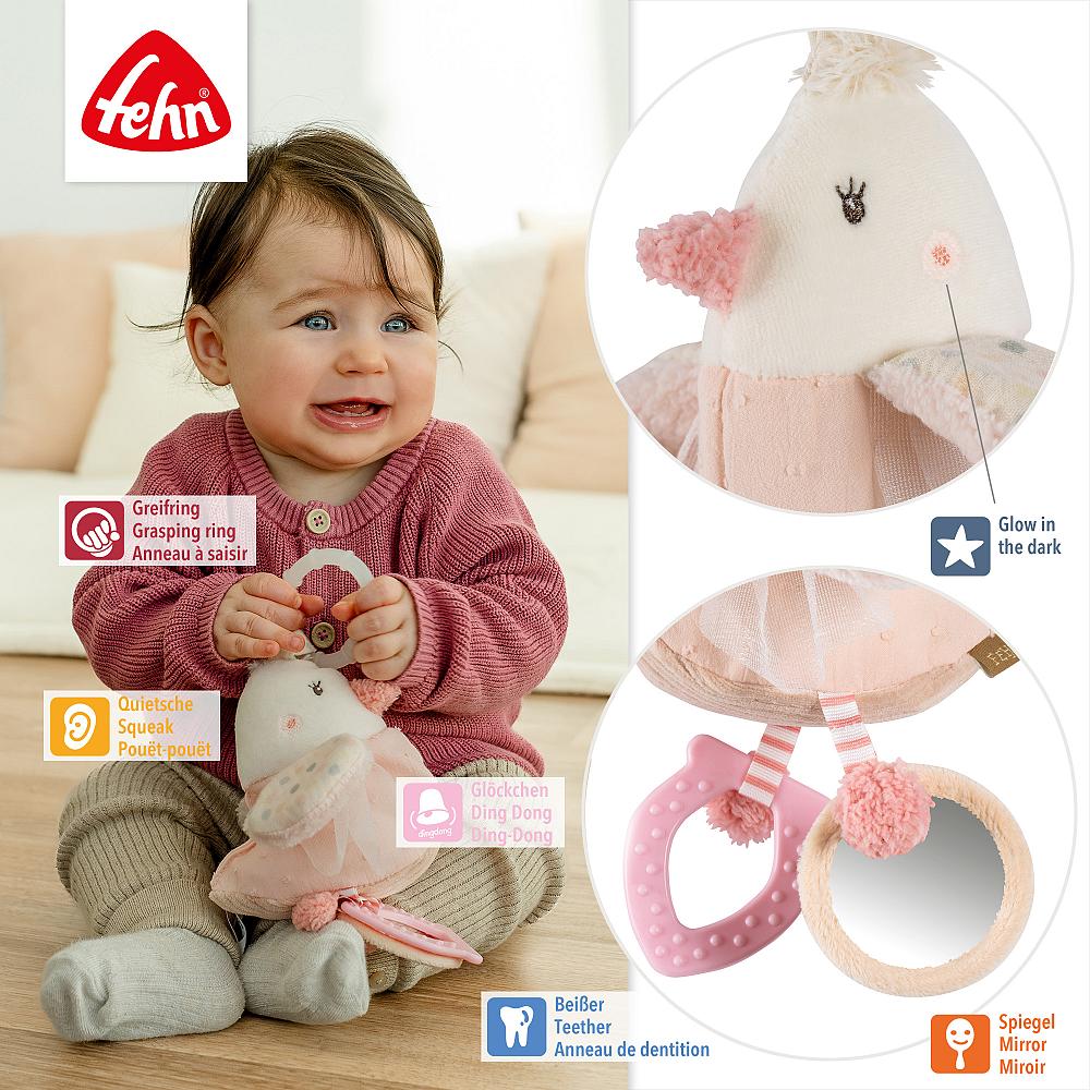 O bebé pode descobrir-se de forma lúdica no pequeno espelho, faz barulhos engraçados com o sino do passarinho e o mordedor macio ajuda na dentição.
