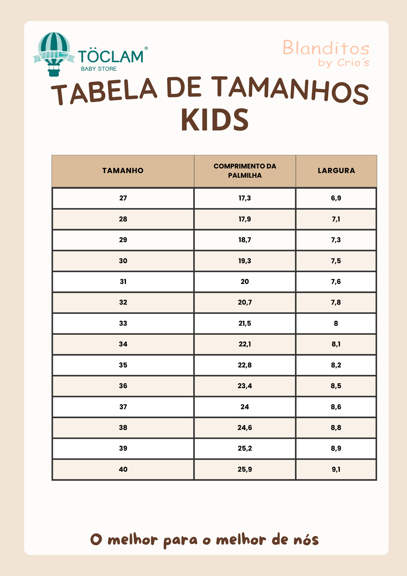 Para saber qual o tamanho de que necessita, deve simplesmente medir o comprimento do pé. Coloque o pé dos mais pequenos sob uma folha de papel em branco (com a criança em pé e não sentada). Traça um ponto no dedo mais comprido do pé e outro no calcanhar. Meça a distância desde o calcanhar até à ponta do seu dedo mais comprido. Faça o mesmo processo na largura, medindo a zona mais larga do pezinho.