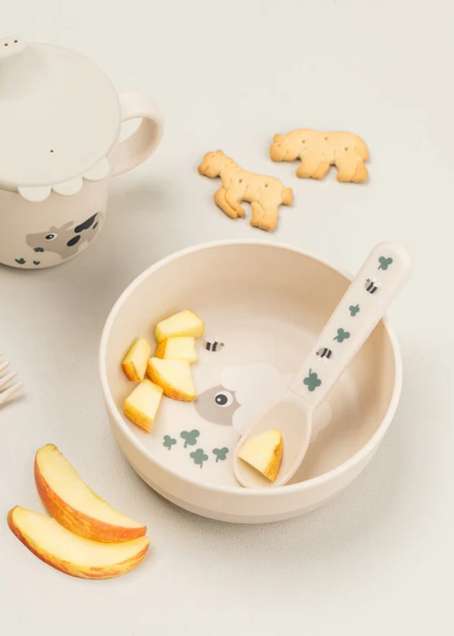 A borda alta ajuda os pequenos a pegar a comida com a mão.